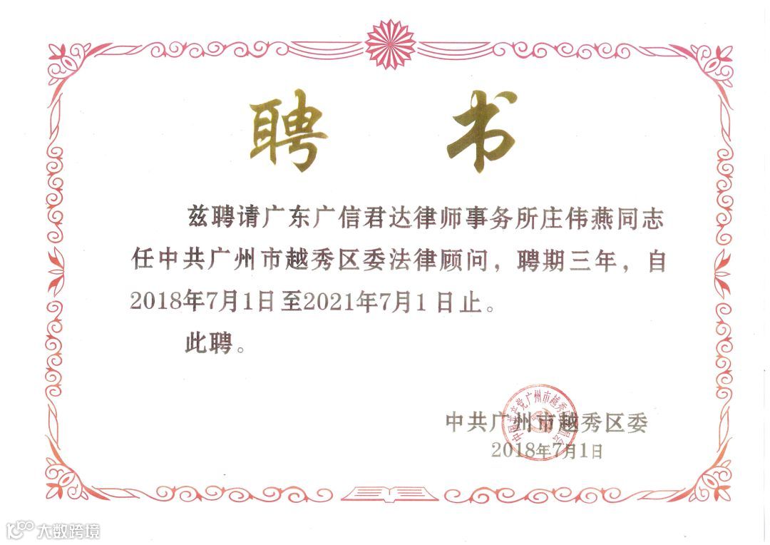 2018年7月17日上午,中共广州市越秀区委(简称“越秀区委”)举行法律顾问聘任仪式,聘请中共广东广信君达律师事务所委员会副书记、高级合伙人庄伟燕律师,中山大学法学院副院长任强和广州大学法学院副院长蒋银华为越秀区委首届法律顾问,标志着越秀区委法律顾问制度正式建立。越秀区领导王焕清、李世通、温志文、张文胜、万云峰、邱灵、林小青,各街道党工委书记及有关单位领导出席了聘任仪式。