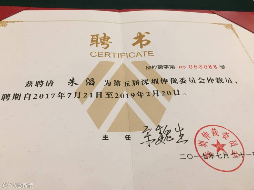 2017年12月16日,深圳仲裁委员会2017年新聘仲裁员聘书颁发仪式在深圳五洲宾馆举行。会上宣布了关于聘任仲裁员的决定,并对新聘仲裁员代表颁发聘书。广东广信君达律师事务所律师团队专职顾问朱滔获聘担任深圳仲裁委员会仲裁员,作为参会代表,接受深圳仲裁委员会宋魏生主任颁发的聘书。