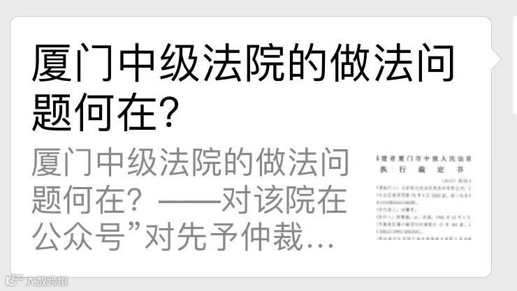 5月31日,湛江仲裁委的官方微信公众号做出强烈反馈,发布题为《厦门中级法院的做法问题何在?——对该院在公众号”对先予仲裁执行说不”一文的反馈意见》。