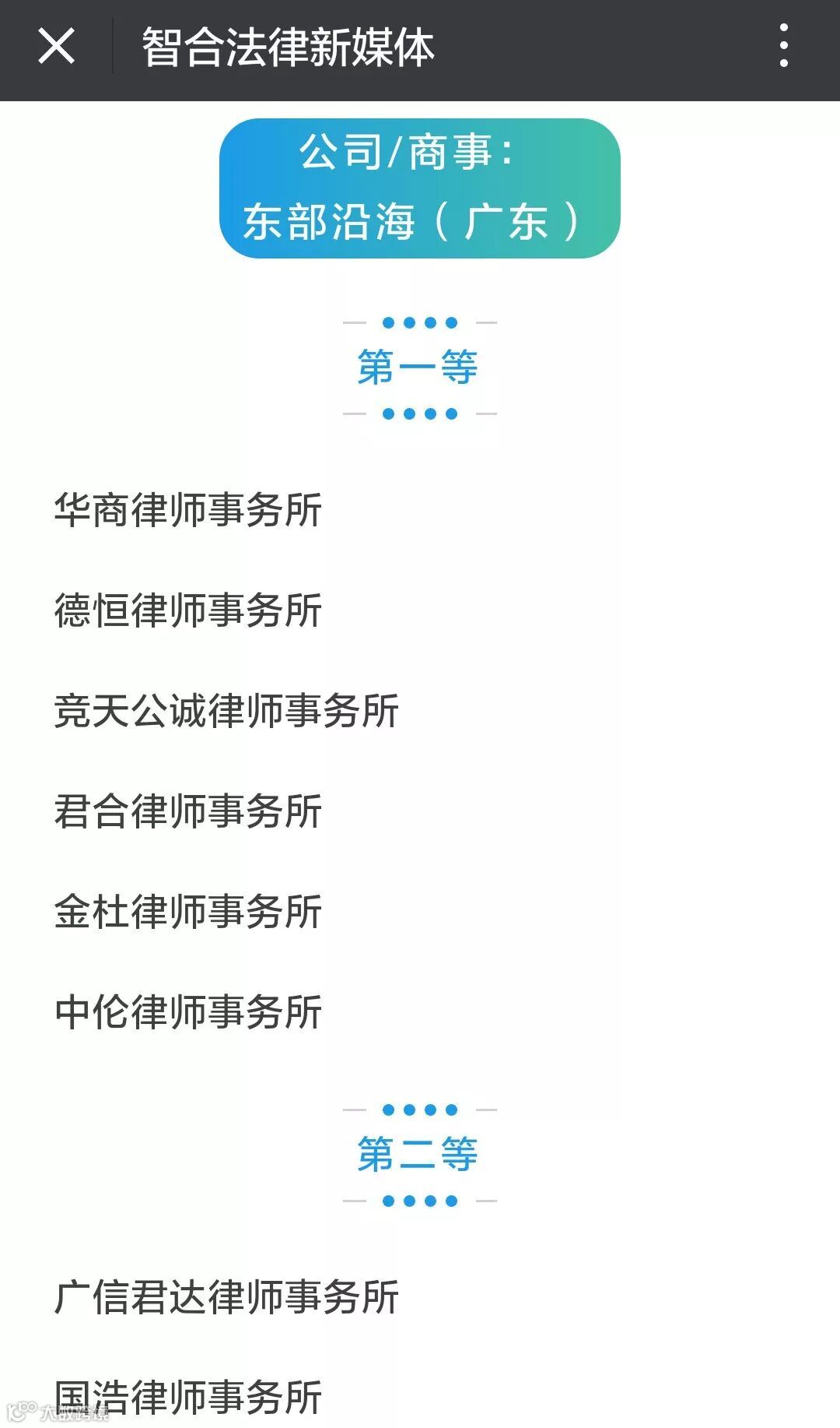 2017年12月7日,著名法律评级机构钱伯斯(Chambers and Partners)发布了《2018亚太法律指南》(2018 Asia-Pacific Guide),公布2018年亚太地区律所排名。在业务排名中,广东广信君达律师事务所凭优秀的业务实力、出色的法律服务质量及客户的肯定,被评为“公司/商事”法律领域东部沿海(广东)二等律师事务所。