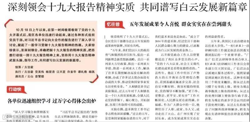 同日,《白云时事》头版以《深刻领会十九大报告精神实质,共同谱写白云发展新篇章》为题,认为广信君达开展村(社区)法律顾问工作将依法治国落实到基层,有利于推动我国民主法治建设发展。