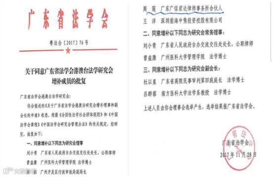 近日,广东省法学会公布《关于同意广东省法学会港澳台法学研究会增补成员的批复》文件,广东广信君达律师事务所合伙人周莲律师成功当选为港澳台法学研究会理事。