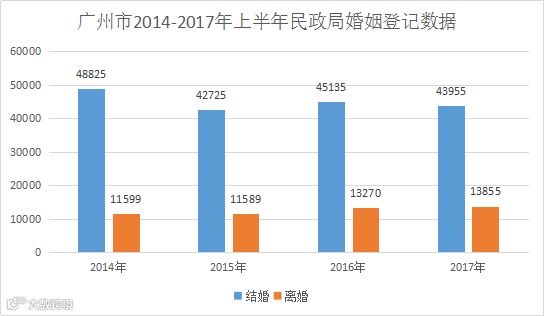 1、广州市2014-2017上半年民政局婚姻登记数据。