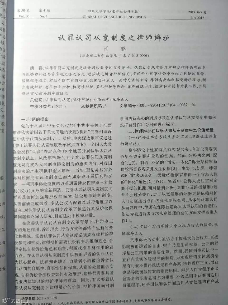 近日,广东广信君达律师事务所肖璐律师的学术理论文章《认罪认罚从宽制度之律师辩护》发表于全国中文核心期刊《郑州大学学报(哲学社会科学版)》第2017年第4期。