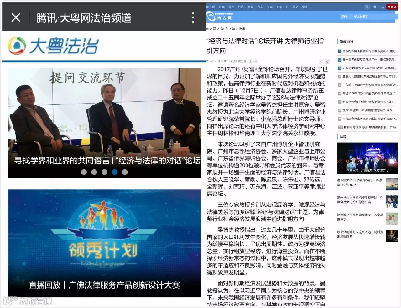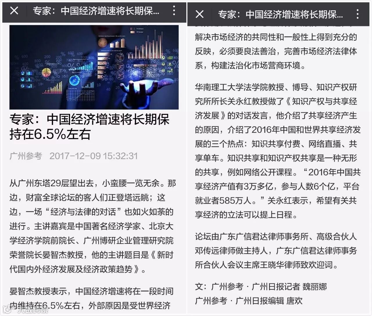 2017年12月7日,广东广信君达律师事务所举办主题为“经济与法律的对话”论坛,著名经济学家、北京大学经济学院前院长、广州博研企业管理研究院荣誉院长、李克强总理博士论文导师晏智杰教授,中山大学法律经济学研究中心主任、中国商法学会副会长、法学教授、博士生导师周林彬教授,及国家知识产权人才培训(广东)基地常务副主任、广州市知识产权研究会理事长、知识产权研究所所长、华南理工大学法学院教授关永红教授担任论坛嘉宾。