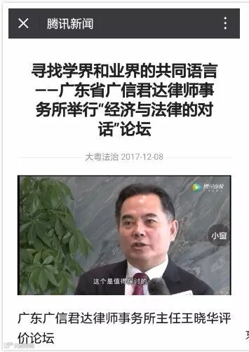 论坛结束后,广信君达合伙人会议主席王晓华律师接受了广东电视台和腾讯·大粤网两家媒体的采访。王晓华律师指出,此次论坛的举办旨在探讨经济与法律的关系以及两者产生的效应,对律师与企业家都有重大启发作用。广信君达将紧跟经济发展形势,把握时代发展的脉搏和前进的方向,实现“做大做强做优”的目标。