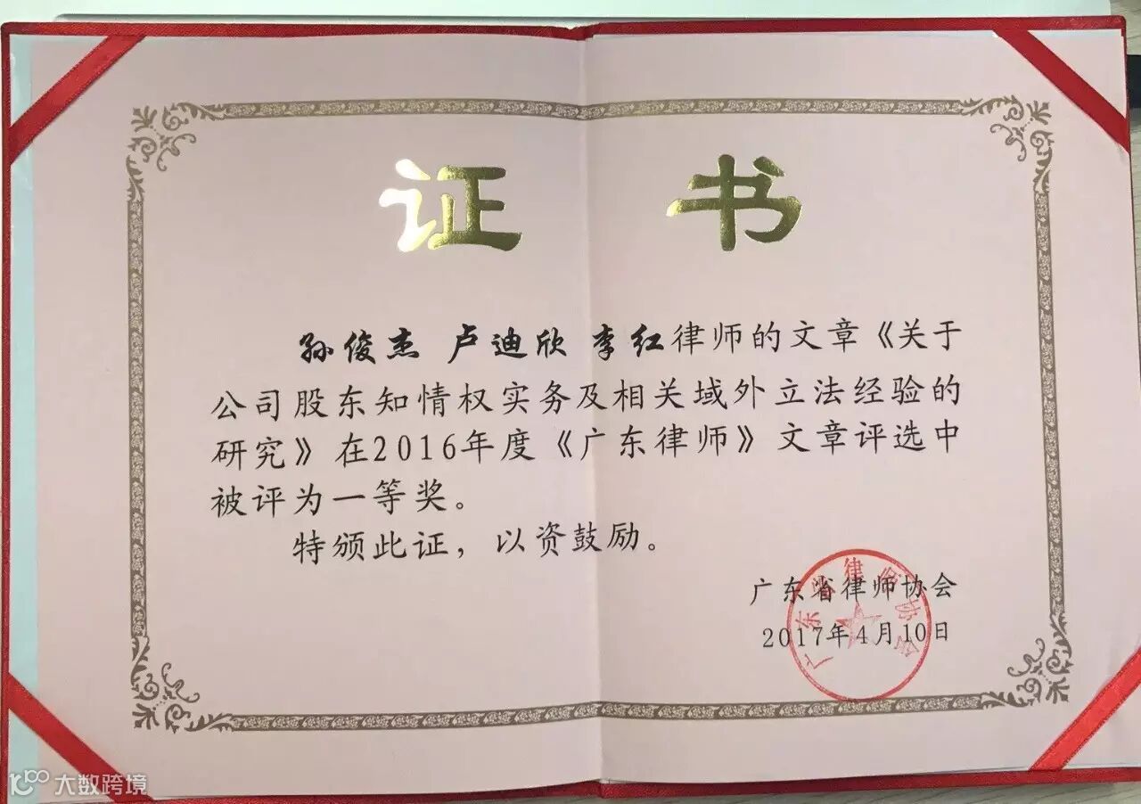 近日,广东广信君达律师事务所孙俊杰合伙人律师、卢迪欣律师、李红实习律师撰写的《关于公司股东知情权实务及相关域外立法经验的研究》在2016年度《广东律师》文章评选中被评为一等奖。