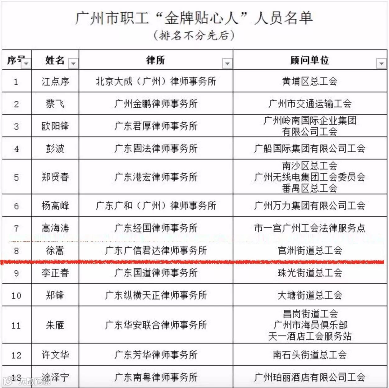 为进一步发挥广州市工会法律服务团队律师在维护社会和谐稳定的作用,近期,广州市总工会开展广州市职工“金牌贴心人”推荐活动。该活动经市区总工会推荐、网络投票、汇总评分、工会法律服务考核小组讨论等流程,现已顺利完成。广东广信君达律师事务所合伙人徐嵩律师荣获“金牌贴心人”称号。