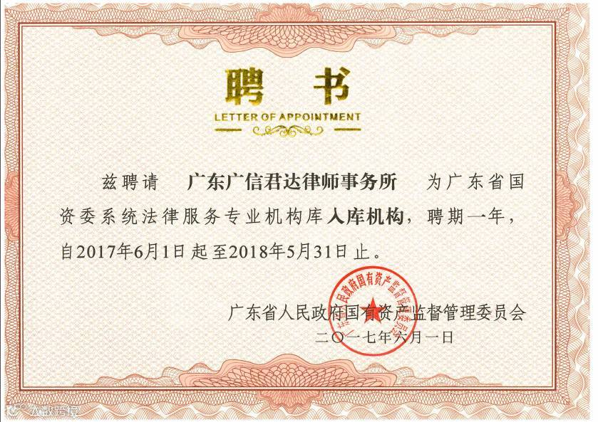 2017年5月31日,广东广信君达律师事务所收到广东省人民政府国有资产监督管理委员会(简称“省国资委”)颁发的聘书,广信君达以优质的法律服务和强大的专业实力,再次成功入选为“广东省国资委系统法律服务专业机构库入库机构”。
