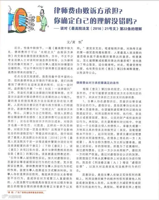 《律师费由败诉方承担?你确定自己的理解没错吗?》一文中,黄律师对最高人民法院日前出台的《最高人民法院关于进一步推进案件繁简分流优化司法资源配置的若干意见》中关于“律师费承担”的问题作了理性分析,合理地指出律师费由对方承担所需满足的条件。