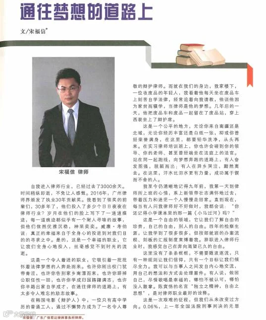《通往梦想的道路上》一文,宋律师主要结合自身多年的执业经历,畅谈对律师职业的幸福感受与体会,展现出了广州律师的良好精神形象以及坚定的理想信念。