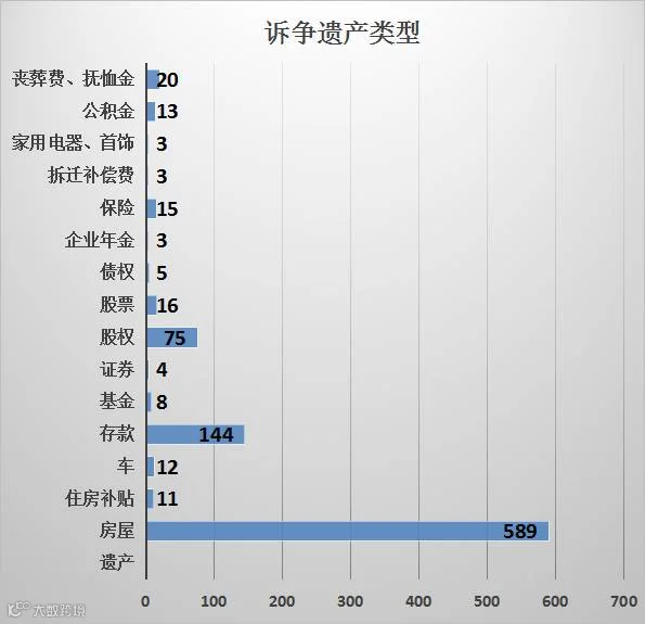 涉及分割房产的案件数量最多,为589件。房产价值高且调查较为容易,因此属于遗产争夺的“香饽饽”,但实际上房产的传承方式较为简单,可能一纸“遗嘱”便能定纷止争。