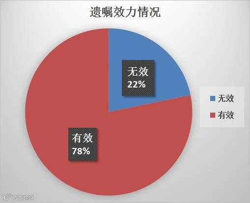 在涉遗嘱的案件中,法院经审理后认定遗嘱有效的为169件,占比达78%。另认定有件47案件所涉的遗嘱无效。