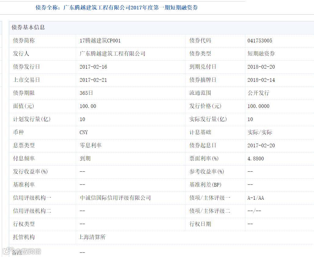 广东腾越建筑工程有限公司(简称“腾越建筑”)公开发行2017年度第一期短期融资券,债券简称为17腾越建筑CP001,债券代码为041753005,第一期发行规模为10亿元,票面利率为4.88%。本次债券经中诚信国际信用评级有限公司综合评定,腾越建筑的主体信用评级为AA,本期债券的信用评级为A-1。