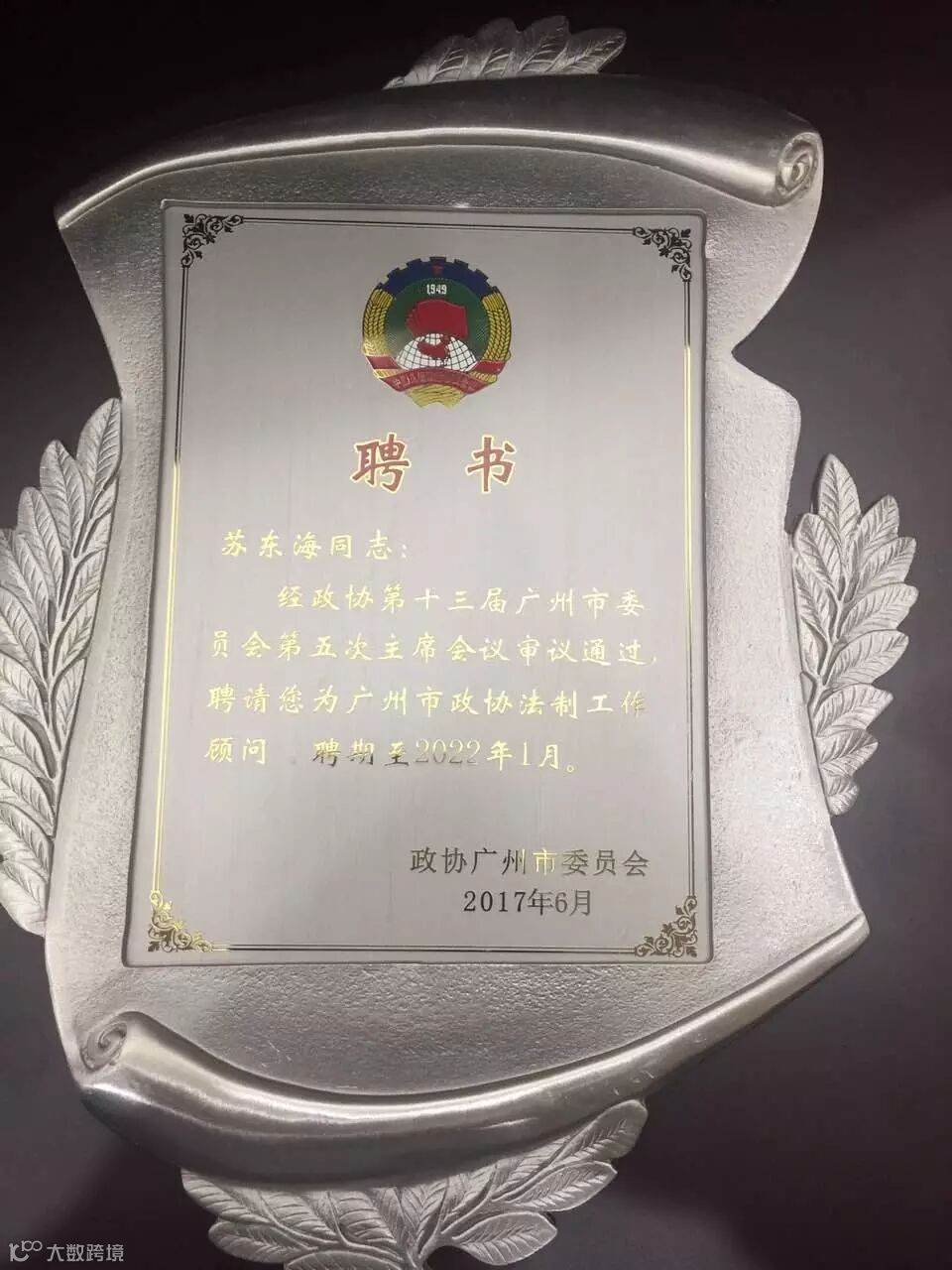 2017年6月29日下午,广州市政协隆重举行十三届广州市政协法制工作顾问聘任仪式。其中,广东广信君达律师事务所高级合伙人苏东海律师获聘为十三届广州市政协法制工作顾问,市政协主席刘悦伦出席仪式并为本届法制工作顾问颁发聘书。