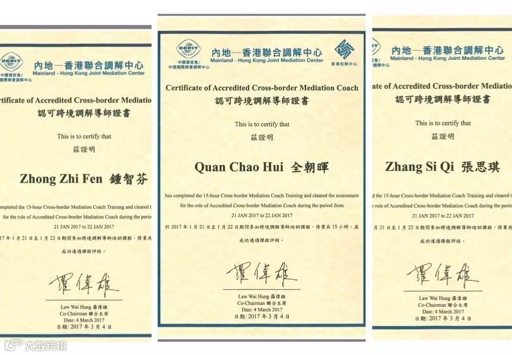 广信君达高级合伙人全朝晖律师、钟智芬合伙人律师及张思琪律师参加了此次课程培训并于2017年2月1日顺利通过MHJMC评核,获得了MHJMC签发的认可跨境调解导师专业资历。