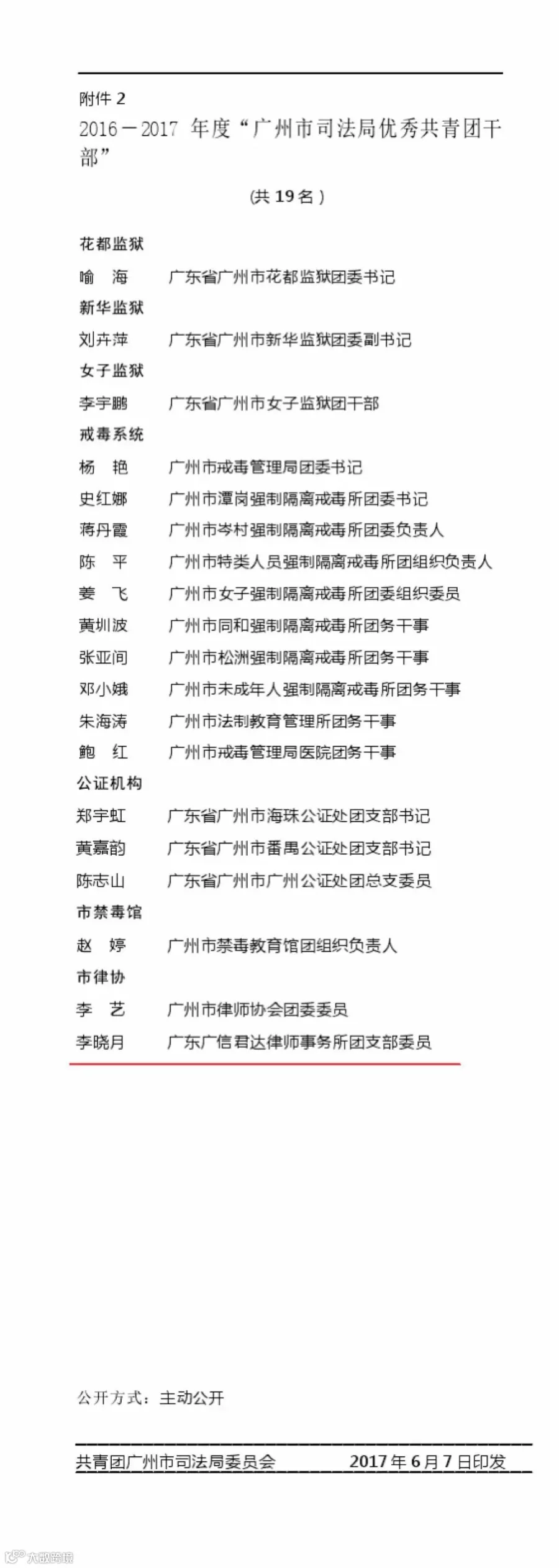 根据附件《关于2016-2017年度广州市司法局优秀团员、优秀团干部的通报》,本次共有25人获评为“广州市司法局优秀共青团员”,19 人获评为“广州市司法局优秀团干部”。其中,广东广信君达律师事务所团支部委员李晓月律师获评为“2016-2017 年度‘广州市司法局优秀共青团干部’”。