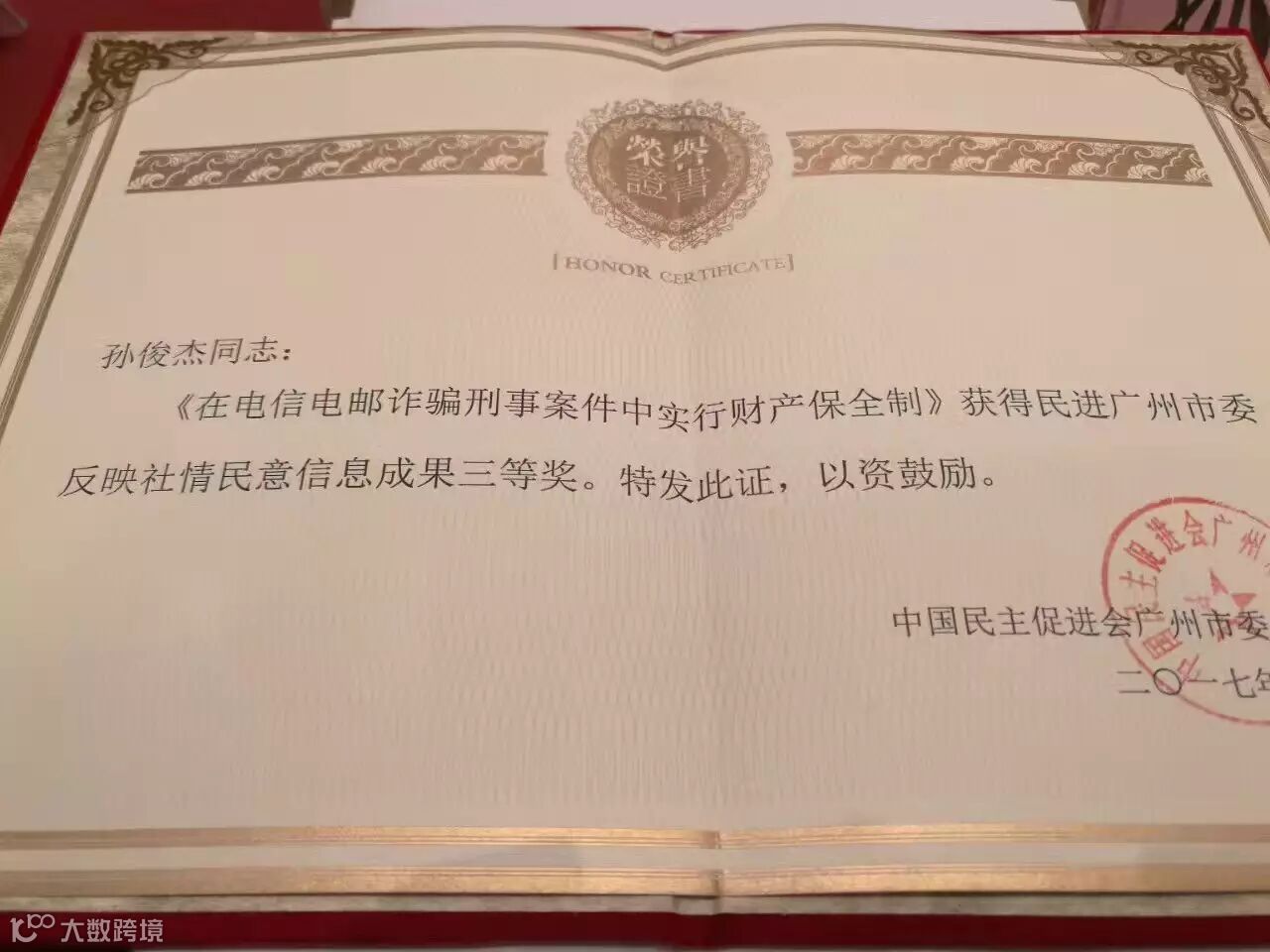 近日,孙俊杰律师撰写的理论文章——《在电信电邮诈骗刑事案件中实行财产保全制》获得民进广州市委反映社情民意信息成果三等奖。该统战信息被呈送中央政治局委员、广东省委书记胡春华同志。