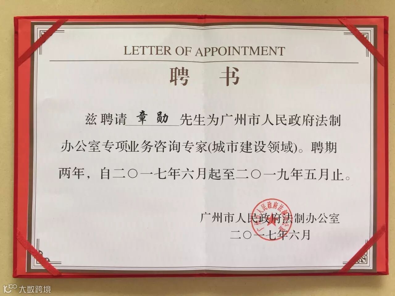 市法制办聘任专项业务咨询专家旨在使政府法律顾问工作进一步走向精细化和专业化。此次章勋律师受聘为市法制办专项业务咨询专家,也是广州市政府对本所律师过往业绩的认可和专业工作的充分肯定。本所在政府领域的法律服务取得显著成绩,曾为广州市国土资源和规划委员会、广州市住房和城乡建设委员会、广州市农业局、广州市土地开发中心、广州市土地利用发展中心等国土规划、城市建设领域的政府部门提供常年法律顾问服务,也曾代理广州市的政府部门参加过多个重大行政诉讼和行政复议案件,并取得较好的成果。