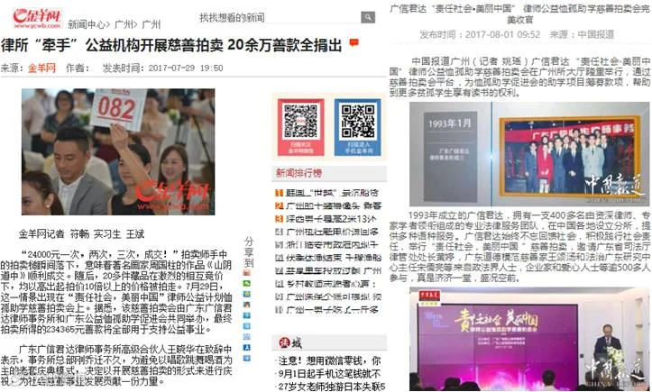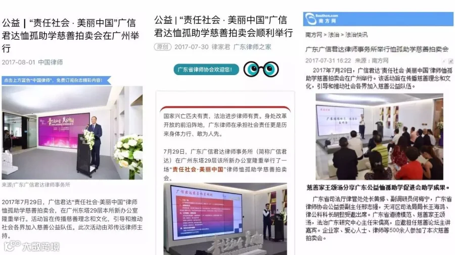 2017年7月29日,广信君达“责任社会·美丽中国” 律师恤孤助学慈善拍卖会在本所新办公室举行。该活动旨在传播慈善理念和文化,引导和推动社会各界参加慈善公益队伍。