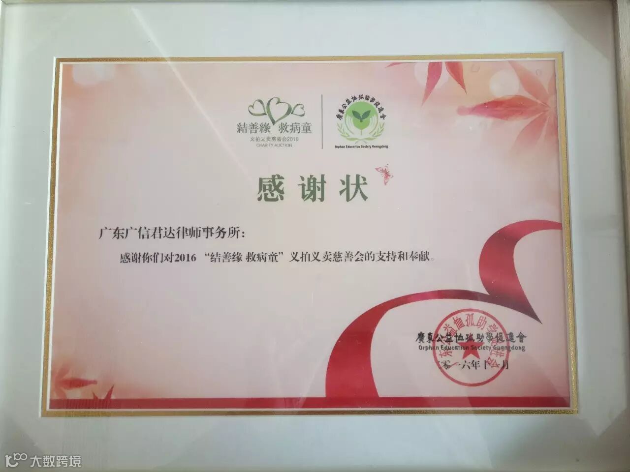 近日,广东广信君达律师事务所收到广东公益恤孤助学促进会颁发的2016“结善缘 救病童”义拍义卖慈善会感谢状。