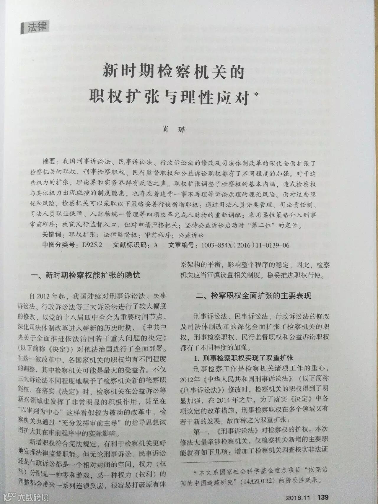 近日,广东广信君达律师事务所兼职律师肖璐的学术文章《新时期检察机关的职权扩张与理性应对》发表于湖北省社科院主办的全国中文核心期刊《江汉论坛》2016年第11期。