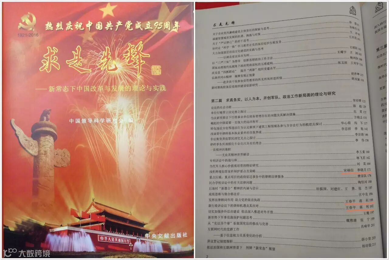 其中,广东广信君达律师事务所高级合伙人宋福信律师和专职律师李晓月合著的《浅析跨境犯罪案件辩护要点及策略》,合伙人王春平律师和业务品牌部主管蒋利合著的《发挥法律顾问作用 助力党的依法执政》及《新行政诉讼法下的律师机遇机器应对》共3篇理论文章被收录入《求是先锋——新常态下中国改革与发展的理论与实践》丛书中。