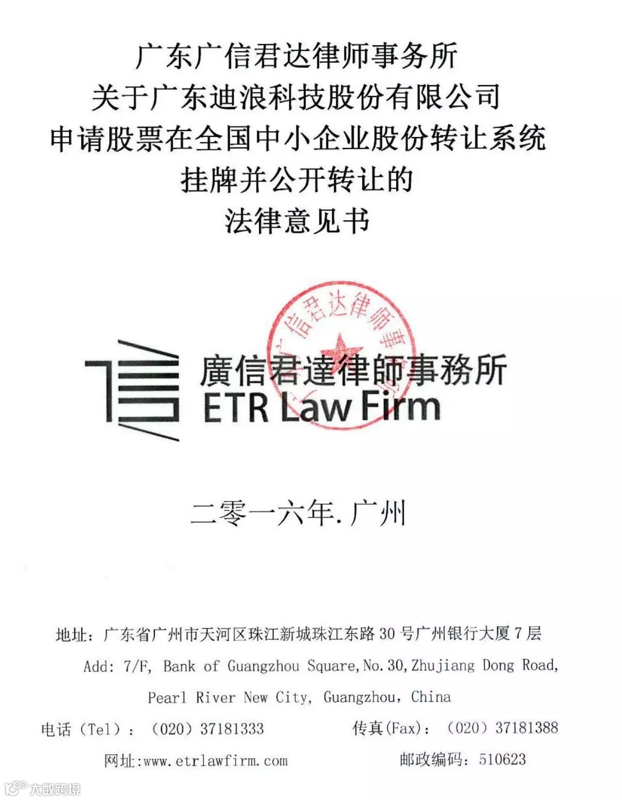 在迪浪科技新三板挂牌项目中,广东广信君达律师事务所受聘作为专项法律顾问,合伙人张雪芳律师,钟梦影律师,刘宇翔、何淑芬实习律师及其律师团队成员出色地完成了本次法律服务工作,为本次挂牌提供专业、优质、高效的法律服务。本所律师为公司的规范治理提供法律建议及可行性方案,协助迪浪科技整改并完成股份制改革,为公司顺利挂牌新三板缩短了工作时间,提高了效率,得到客户及各合作中介机构的一致好评。