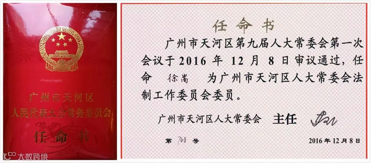 2016年12月,广州市天河区第九届人大常委会在广州市天河区政府召开天河区人大常委会各工委委员集中颁发任命书大会。经广州市天河区第九届人大常委会第一次会议审议通过,广东广信君达律师事务所合伙人徐嵩律师被任命为天河区第九届人大常委会法制工作委员会(简称“人大法工委”)委员。