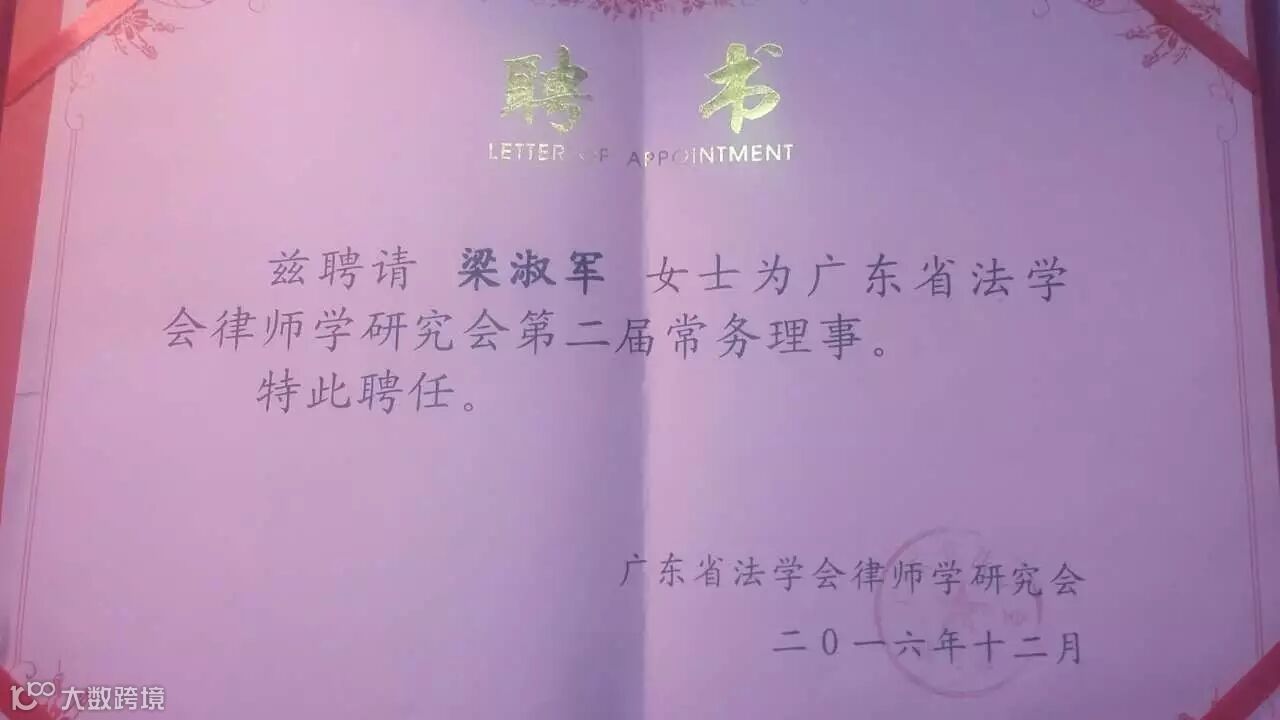 梁淑军律师聘书