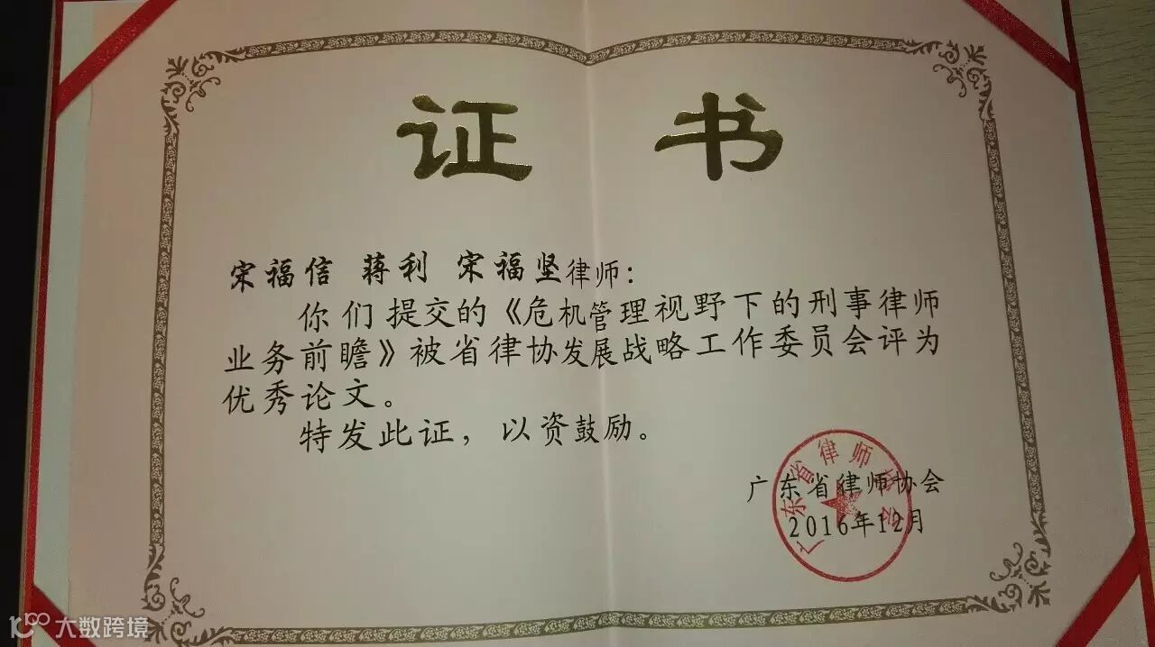 2016年12月,广东广信君达律师事务所高级合伙人宋福信律师、业务品牌部主管蒋利、律师团队专职顾问宋福坚合著的学术文章《危机管理视野下的刑事律师业务前瞻》获广东省律师协会发展战略工作委员会评为优秀论文。