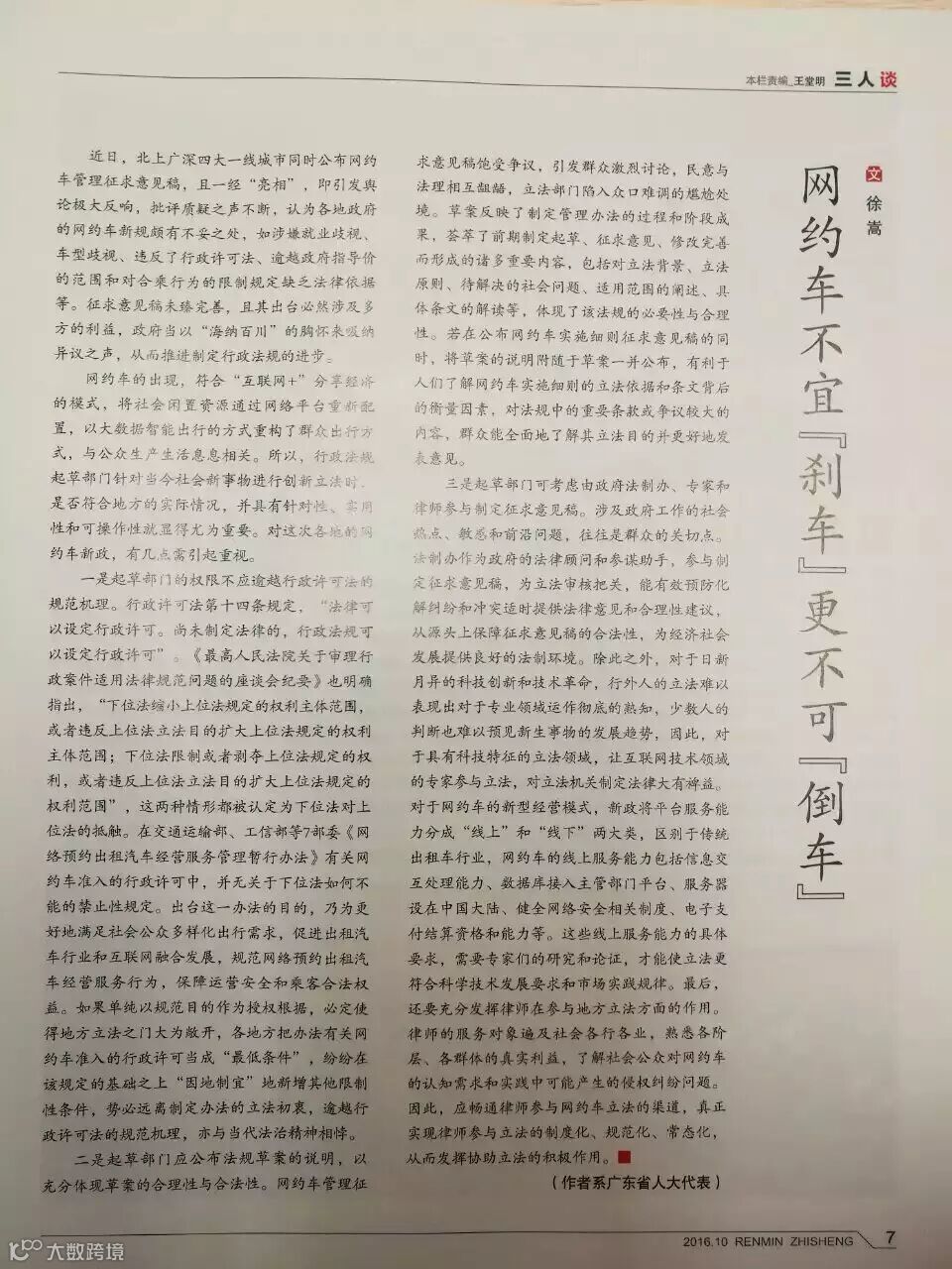 近日,广东广信君达律师事务所合伙人、广东省人大代表徐嵩律师的文章《网约车不宜“刹车”更不可“倒车”》发表于由广东省人大常委会办公厅主办的2016年第10期《人民之声》杂志中。