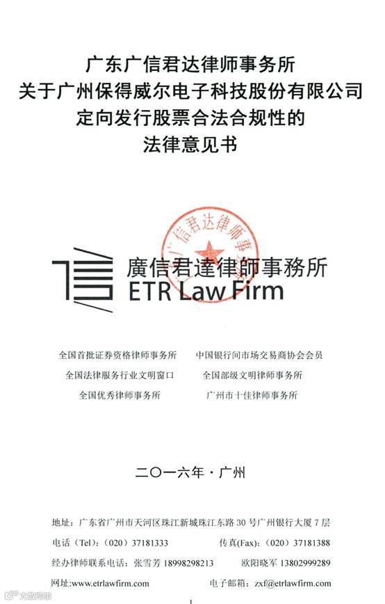 在保得威尔本次股票发行项目中,广东广信君达律师事务所张雪芳合伙人律师、欧阳晓军律师、刘阳、刘宇翔实习律师为本次股票发行提供专业、优质、高效的法律服务。据不完全统计,截至目前,广信君达律师已先后三次协助保得威尔成功定向发行股票,分别于2015年11月、2015年12月、2016年11月(本次定增)助力保得威尔募集资金合计人民币23,309,000元,成为保得威尔增资扩股、在资本市场上进一步融资的战略合作伙伴。
