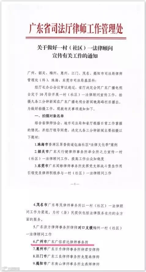2016年9月23日,广东省司法厅律师工作管理处发布了《关于做好一村(社区)一法律顾问宣传有关工作的通知》(简称“《通知》”)。《通知》称,经厅长办公会议审议通过,省厅决定会同广东广播电视台定于10月份开展一村(社区)一法律顾问宣传工作,拍摄9条3分钟新闻在广东广播电视台新闻晚高峰栏目播出。