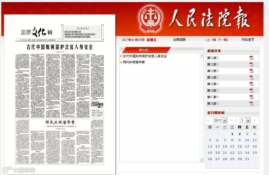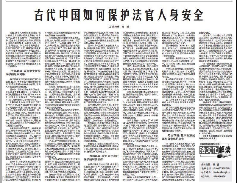 2017年3月3日,《人民法院报》刊登了广东广信君达律师事务所肖璐律师的理论文章《古代中国如何保护法官人身安全》。该文以当下法官人身安全屡遭侵害现象为关注点展开讨论,从外部环境之国家治安管控的组织网络、内部环境之官场特有的保护制度、司法环境之相关程序救济的减压渠道等三个方面来看我国古代法官的人身安全保护,借古鉴今,以期对当下的法官遇袭现象有进一步的省思。