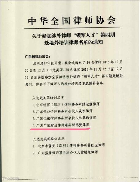 近日,经司法部审批同意,中华全国律师协会(简称“全国律协”)在全国涉外律师“领军人才库”中分别遴选出20名律师赴美国、英国参加境外培训,其中广东广信君达律师事务所陈赞律师入选赴美国培训正式名单。