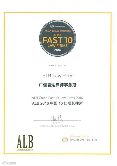 近日,广东广信君达律师事务所收到了《亚洲法律杂志》(ALB)颁发的“ALB 2016年中国十佳成长律所”荣誉证书。