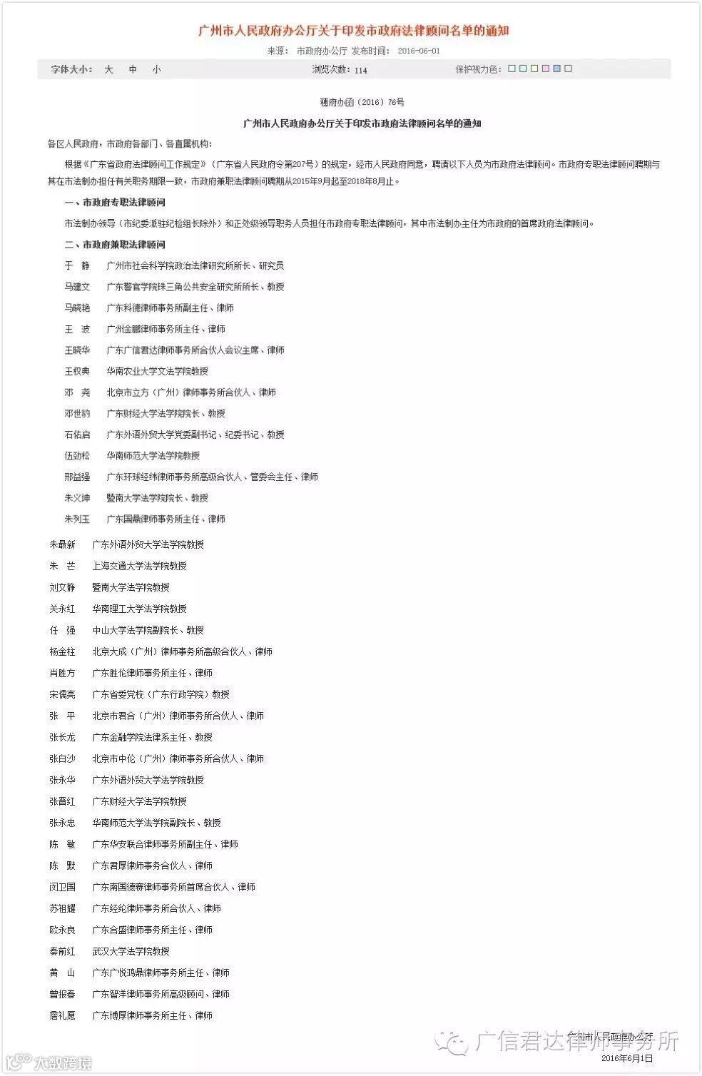 日前,广州市人民政府办公厅网站公布了《广州市人民政府办公厅关于印发市政府法律顾问名单的通知》(穗府办函〔2016〕76号,简称“《通知》”)。《通知》称,根据《广东省政府法律顾问工作规定》(广东省人民政府令第207号)的规定,经市人民政府同意,市政府专职法律顾问由市法制办领导和正处级领导职务人员担任,市法制办主任为市政府的首席政府法律顾问;市政府兼职法律顾问由于静等36名法学专家和律师担任,聘期从2015年9月起至2018年8月止。