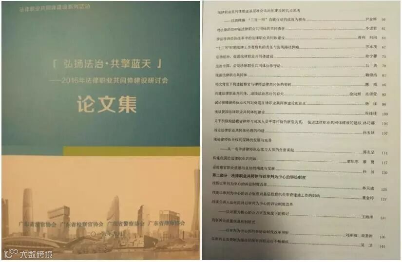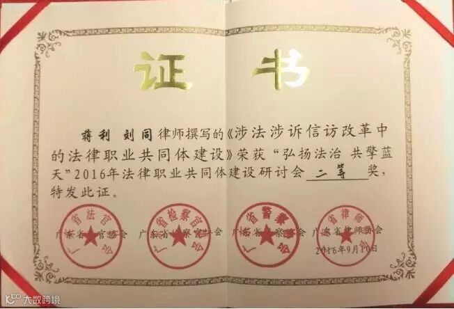 会上,广东广信君达律师事务所业务品牌部主管蒋利、刘同律师合著的理论文章《涉法涉诉信访改革中的法律职业共同体建设》荣获广东省法官协会、广东省检察官协会、广东省警察协会、广东省律师协会联合主办的“弘扬法治 共擎蓝天——2016年法律职业共同体建设研讨会”二等奖,并被选编发表于论文集中。