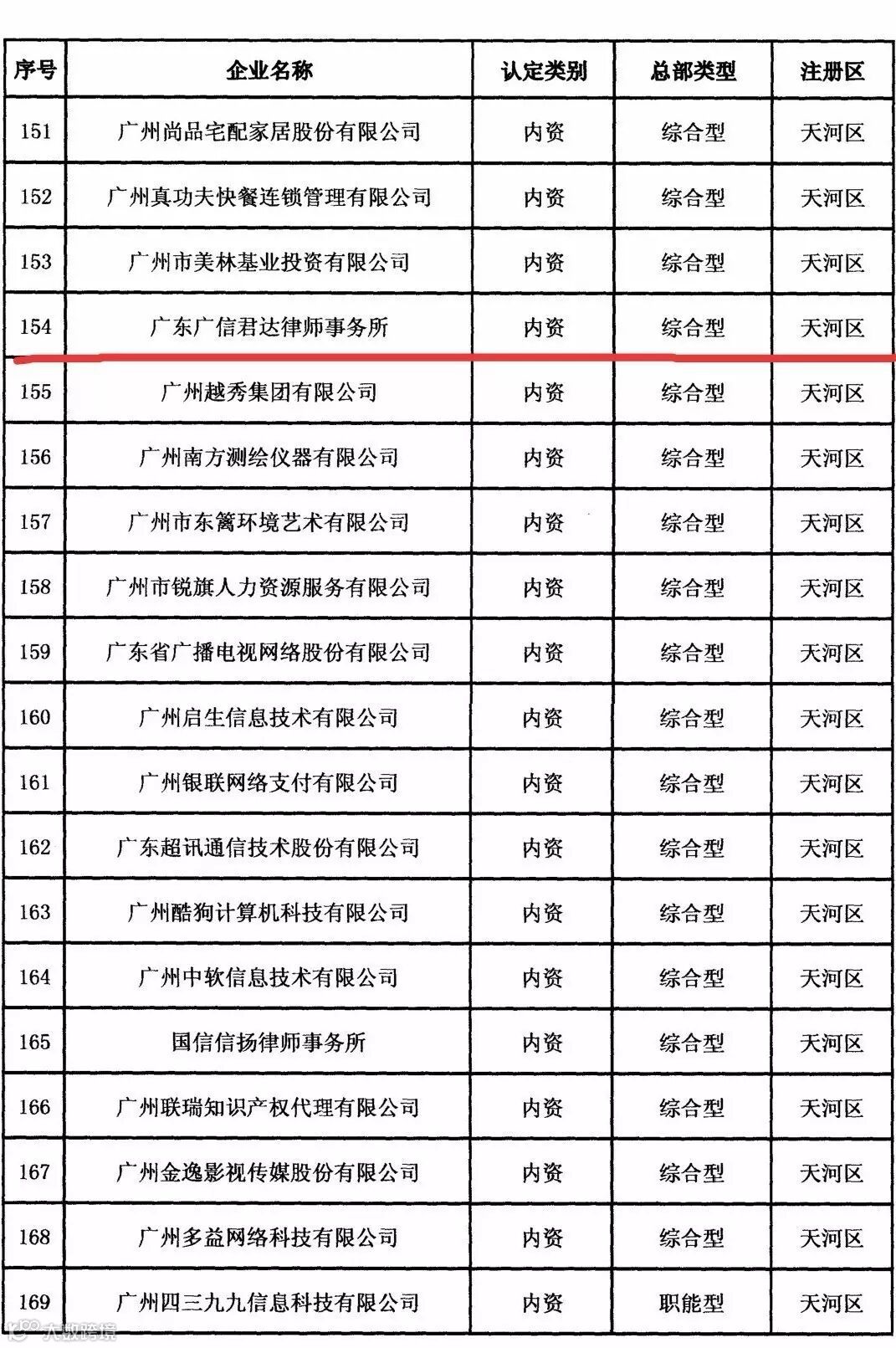 2017年3月2日,根据《广州市服务业发展领导小组办公室关于公布2016年度广州市总部企业名单的通知》,经广州市人民政府同意,包括广东广信君达律师事务所在内的370家企业获评为2016年度广州市总部企业,其中律师行业共3家。