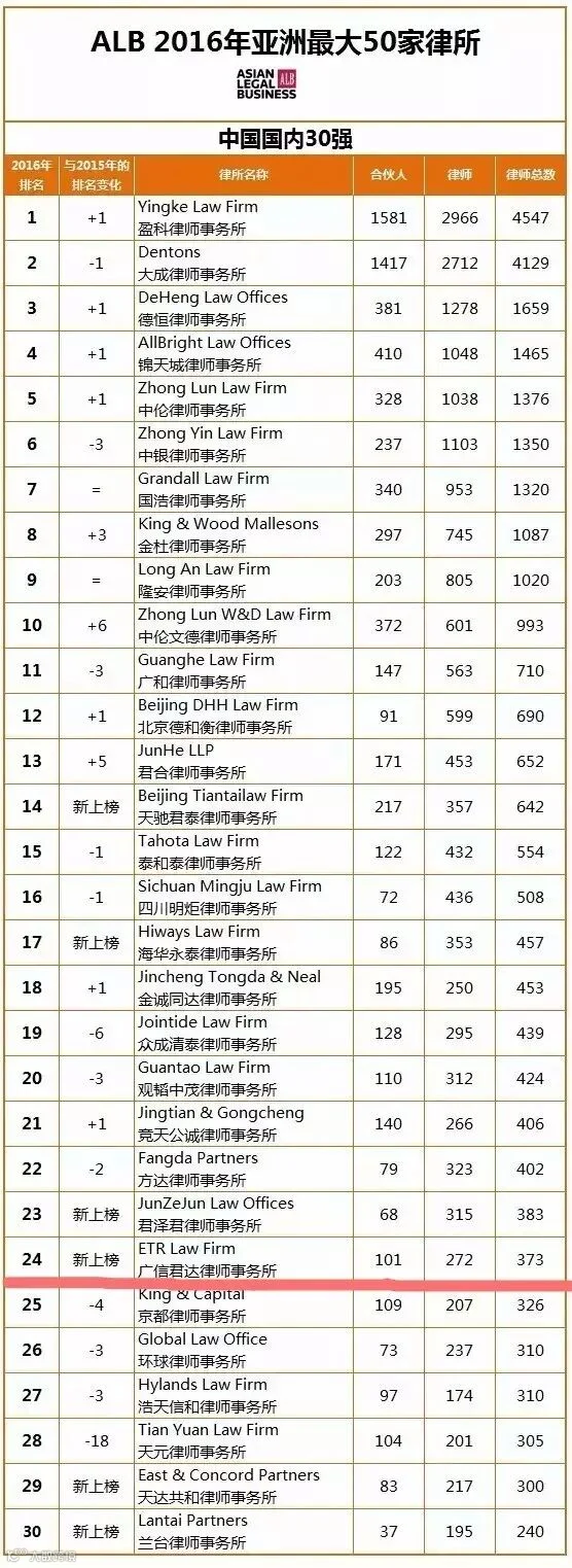 2016年8至9月,ALB联系各大律师事务所,收集其在亚洲各国分所的所有合伙人和律师的人数,用数据来表明律师事务所在规模上的成长扩张。在过去一年中,不少国内综合性大型律师事务所不断推进自身的国内外的战略进程,均取得不错的规模化发展成果。其中,经过合并改制以来近四年的发展,广信君达已成为华南地区规模最大、历史最悠久、综合实力最强的律所之一,并继2016年先后获评为ALB2016“年度最佳中国南部律师事务所”、ALB2016中国十佳成长律所之后,再次荣登 ALB 2016年亚洲最大50家律所榜单。