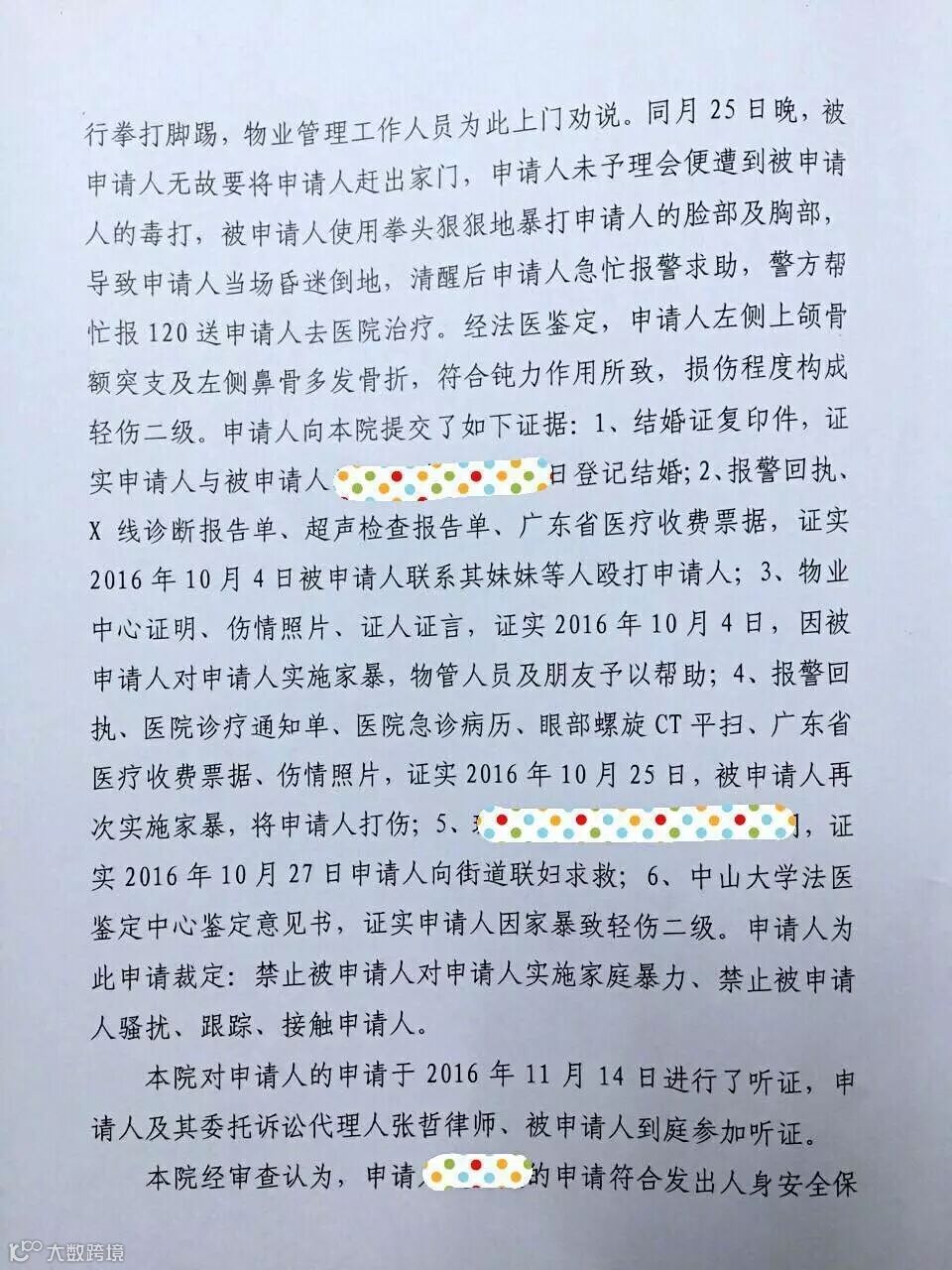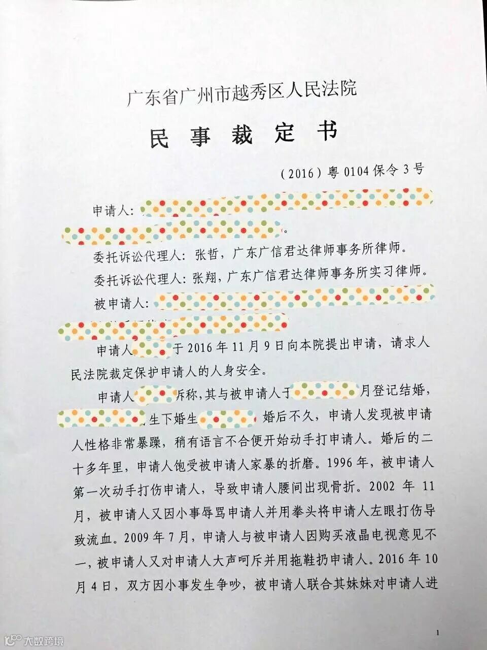 2016年11月14日,广东广信君达律师事务所采华家事法律服务团队成功为当事人申请到了人身安全保护令。据了解,这是自今年3月份我国颁布《反家庭暴力法》(简称《反家暴法》)以来,广信君达律所首例、广州市越秀区人民法院受理的第三例人身安全保护令。