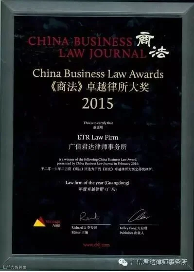 日前,广东广信君达律师事务所(简称“广信君达”)收到了国际领先的中英文法律双月刊物《商法》(China Business Law Journal)颁发的“2015卓越律所大奖(广东)”荣誉牌匾。