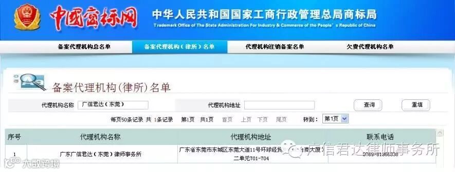 2016年8月15日,经中华人民共和国国家工商行政管理总局商标局确认和通知,广东广信君达(东莞)律师事务所(简称“广信君达东莞分所”)备案商标代理机构(律所)资格审核通过。