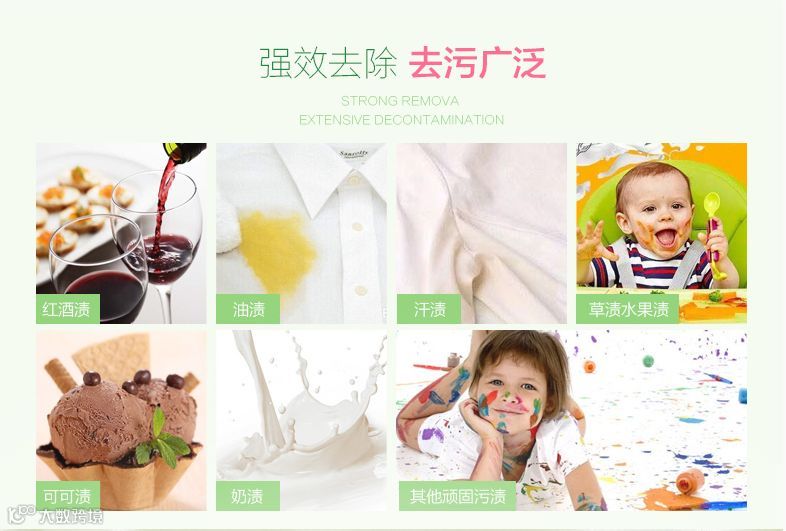 能够深入纤维,清洁顽固污渍。什么墨水渍、油污、水果渍、口红、饮料、汗渍,统统不在话下。其中的植物成分能够呵护衣物纤维,使衣物亮白柔软如新。