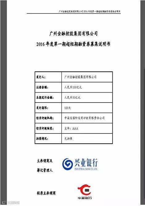 经中国银行间市场交易商协会文件批准,广州金融控股集团有限公司(简称“广州金控”)2016年度第一期超短期融资券于近日在全国银行间债券市场成功发行。广州金控此次成功注册可发行的债券总额为100亿,分期发行。第一期已成功发行的总额为30亿元,票面利率为 3.2%。