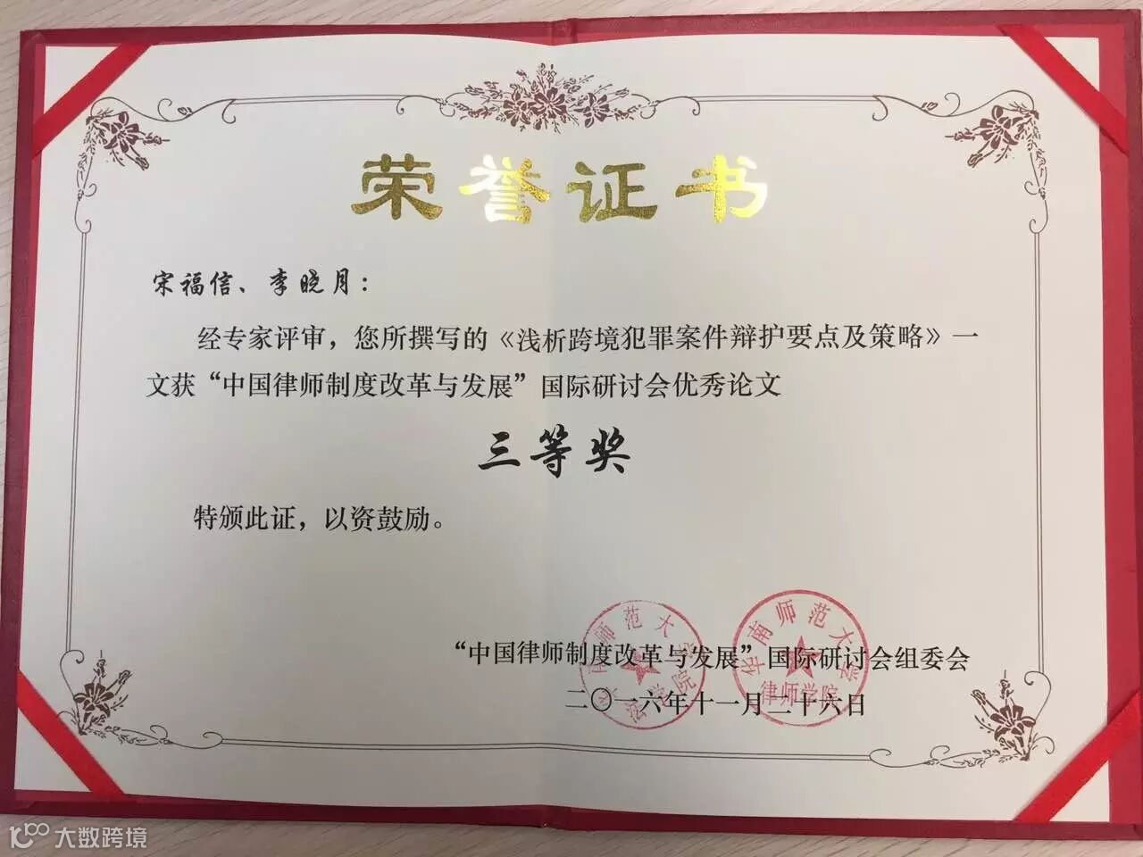 在此次研讨会的论文评选活动中,广东广信君达律师事务所宋福信合伙人律师、李晓月律师合著的理论文章《浅析跨境犯罪案件辩护要点及策略》荣获“中国律师制度改革与发展”国际研讨会优秀论文三等奖。