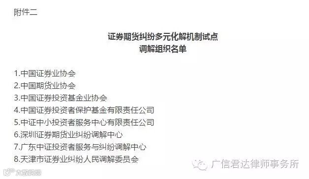 最高法院和中国证监会决定在全国部分地区联合开展建立健全证券期货纠纷多元化解机制的试点工作,根据上述《通知》,本次证券期货纠纷多元化解机制试点地区名单包括北京市、上海市、天津市、广东省广州市、深圳市等重要城市,广东中证投资者服务与纠纷调解中心亦被列入最高法院、中国证监会联合指定的全国八家试点组织之一。