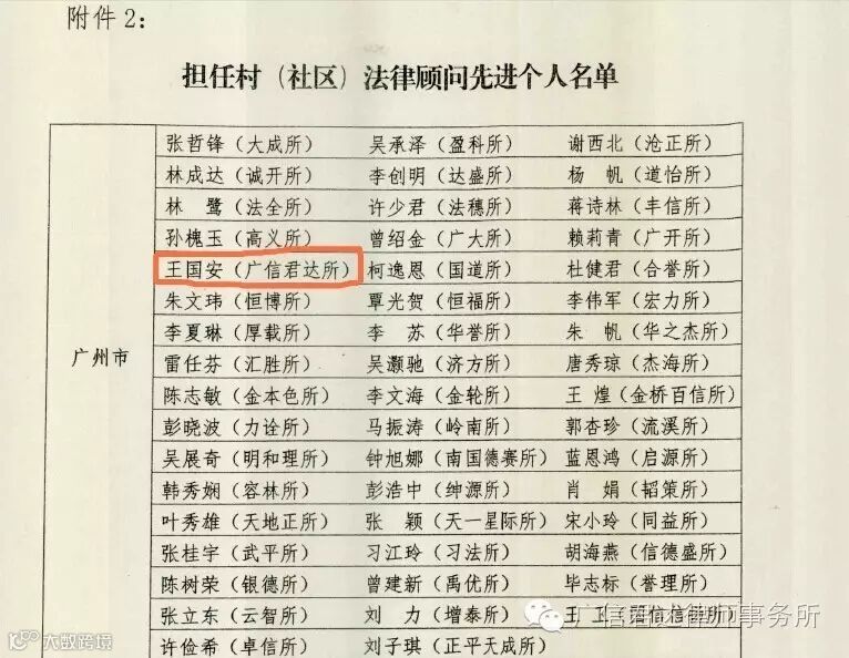 根据《通知》“附件《担任村(社区)法律顾问工作先进个人名单》”,本次共有245名律师获评先进个人,其中广州律师50名。在此次获评的50名广州律师中,广东广信君达律师事务所合伙人王国安律师获评为“担任村(社区)法律顾问工作先进个人”。