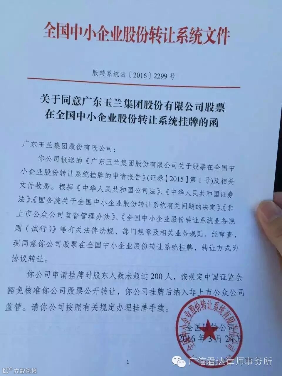 广东玉兰集团股份有限公司是国内外墙纸及软装行业的领头羊,其所有的“玉兰墙纸”等诸多商标享誉国际。2016年3月31日,由广东广信君达律师事务所(简称“广信君达”或者“本所”)合伙人饶芙蓉律师携莫群、尤国宏律师及刘慧珊实习律师组成的律师团队提供挂牌法律服务的玉兰股份(股份代码:836867),在全国中小企业股份转让系统(即“新三板”)成功挂牌并于2016年6月28日举行隆重的挂牌仪式。